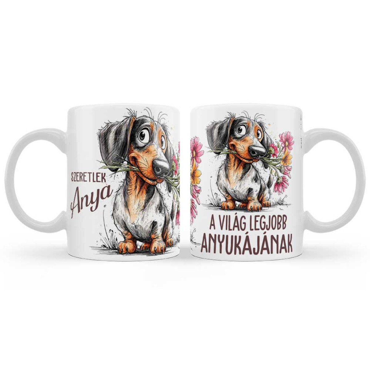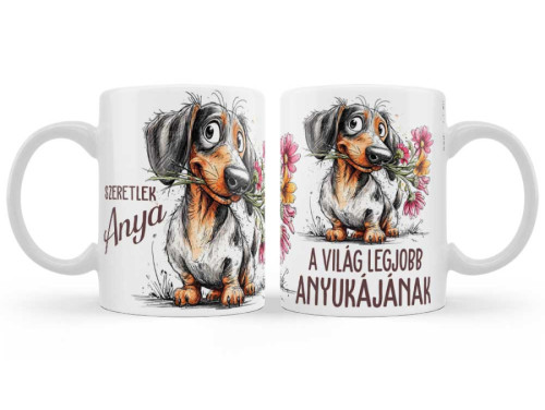 Édesanyád imádja a tacskókat? Akkor ez a vidám, tacskós anyák napi bögre a legjobb választás, hogy kifejezd szeretetedet! A szájában színes virágcsokrot tartó, huncut tekintetű kutyus grafikája minden kávézást és teázást mosollyal indít.