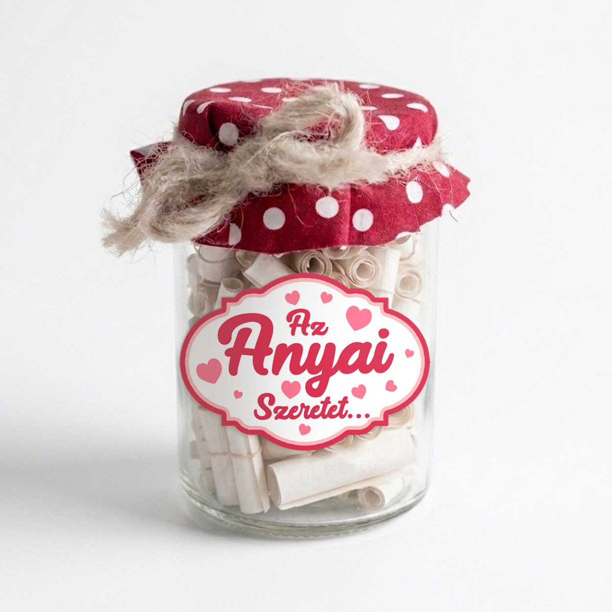 - Egyedi, kézműves design: A 12x7,5 cm-es üveget piros pöttyös szövet tetővel és rusztikus zsineggel díszítettük, így bármelyik otthon kedves dísze lehet.