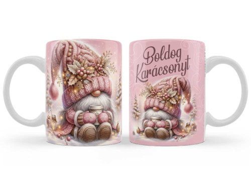 (B1370) Karácsonyi Bögre 3 dl - Boldog Karácsonyt feliratú Rózsaszín Gnome Manós Bögre - Karácsonyi Ajándék