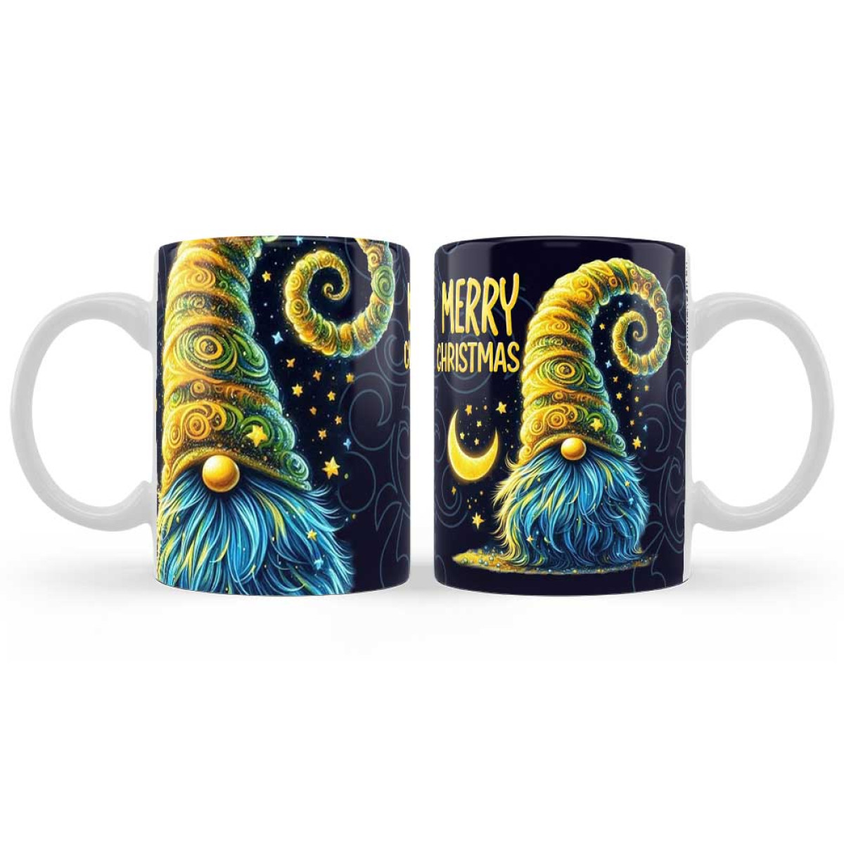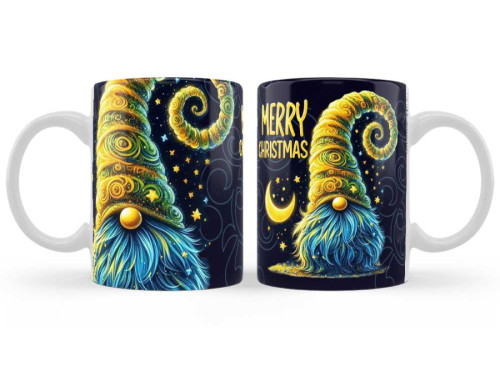 Dobd fel az ünnepi hangulatot ezzel az egyedi, kék hátterű karácsonyi bögrével, amelyet arany-sárga és kék színekben pompázó gnome figura díszít. A „Merry Christmas” felirat modern, mégis ünnepi megjelenést kölcsönöz, így tökéletes választás ajándékként vagy saját használatra a téli hónapokra.