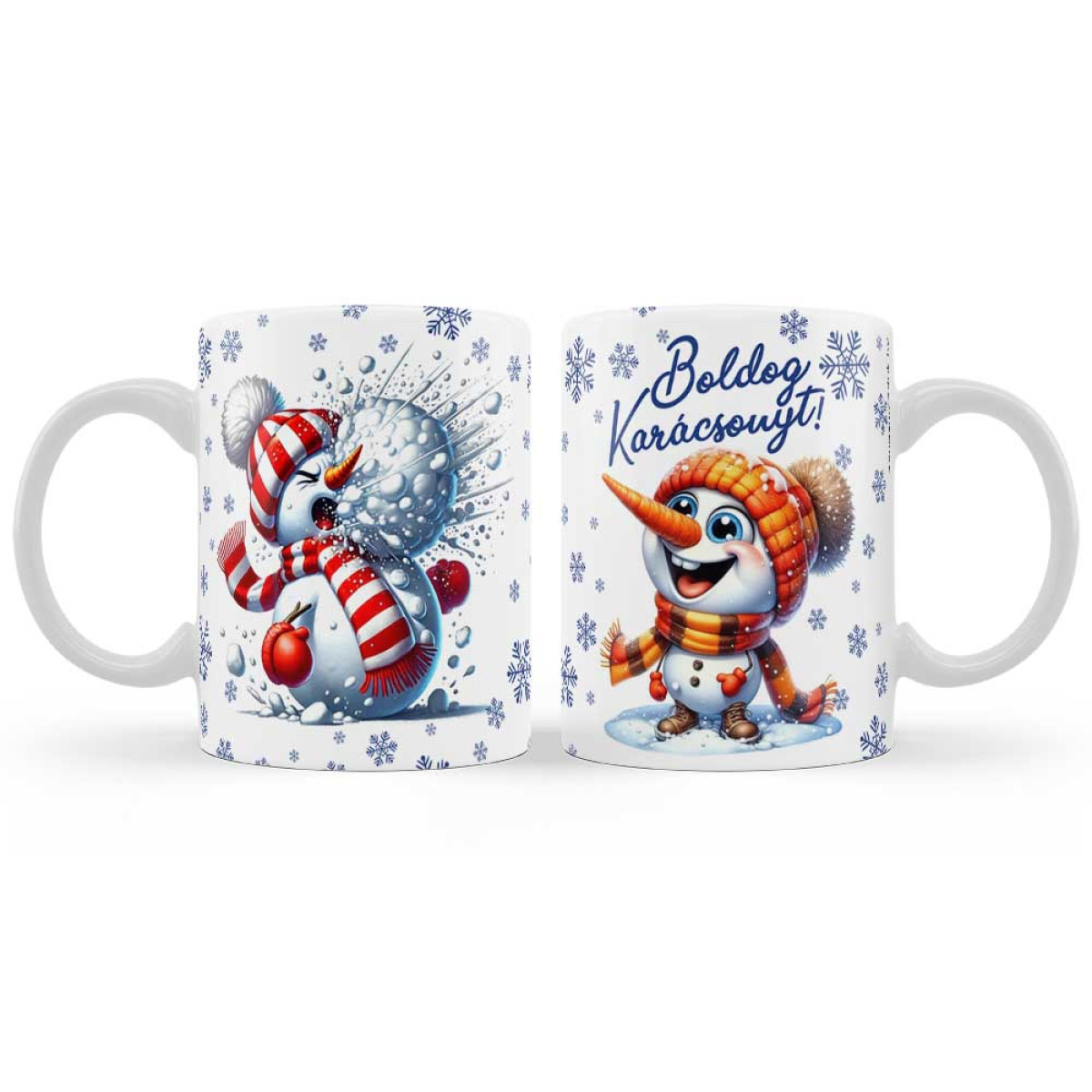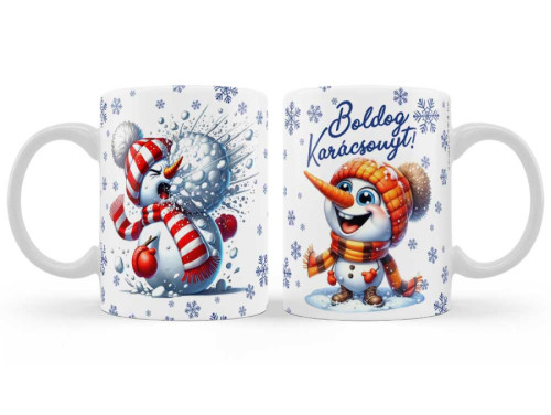 Ez a hóemberes karácsonyi bögre garantáltan feldobja a reggeleket! A kétoldalas mintán egy vidáman nevető hóember és egy játékos hógolyócsata jelenet látható, hópelyhekkel díszített háttérrel. Tökéletes ajándék a téli időszakra, vagy akár saját magadnak a forró italok mellé.
