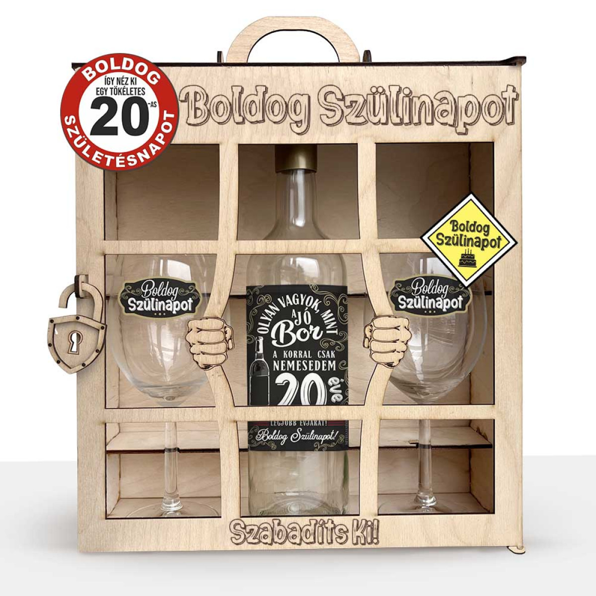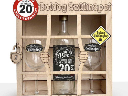 Lepd meg az ünnepeltet egy igazán különleges és vicces ajándékkal! Ez a 20. születésnapi, börtön formájú boros ajándékszett garantáltan mosolyt csal bárki arcára. A masszív fa díszdoboz rácsos börtön dizájnt kapott, rajta pedig vidám feliratokkal – tökéletes választás, ha valami igazán emlékezeteset szeretnél adni.