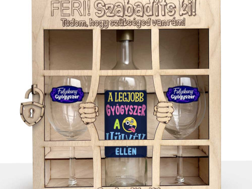 - Igényes, fa boros „börtön” keret – a palack és a két borospohár elegáns, mégis vicces megjelenést kap.