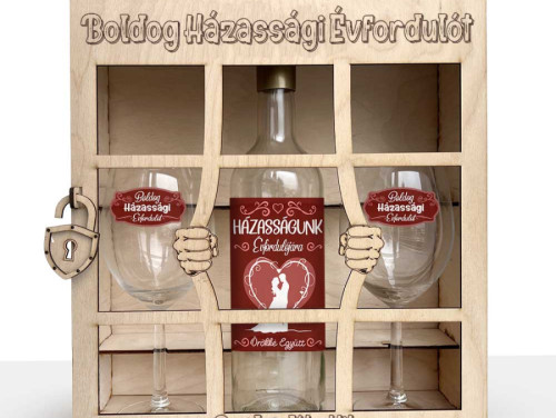 - 1 db borosüveg „Házasságunk évfordulójára” díszcímkével