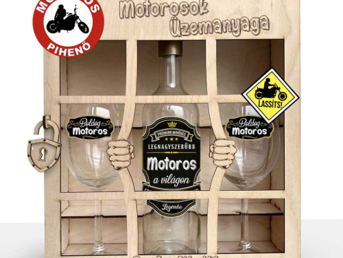 Ha igazán ütős motoros ajándékot keresel, ami egyszerre humoros, elegáns és maradandó, akkor ez a Motorosok Üzemanyaga boros díszdoboz tökéletes választás! A különleges, lézergravírozott fa bortartó egy stílusos borosüveggel és két motoros feliratú borospohárral érkezik – garantáltan mosolyt csal minden motoros arcára.