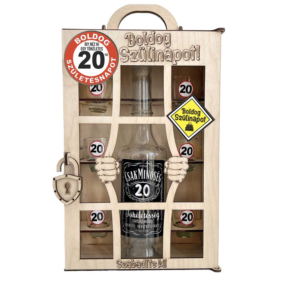 Lepd meg az ünnepeltet egy igazán kreatív és humoros születésnapi ajándékkal! Ez a különleges 20. szülinapi börtönös italos szett nemcsak látványos, de garantáltan mosolyt csal mindenki arcára. A fa börtön mögött egy 0,5 literes üveg és 6 feles pohár rejtőzik – mindegyik 20-as felirattal, az „Igazi minőség – 20” jubileumára hangolva.
