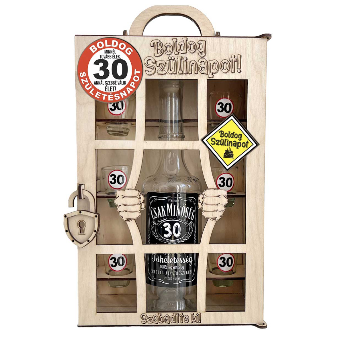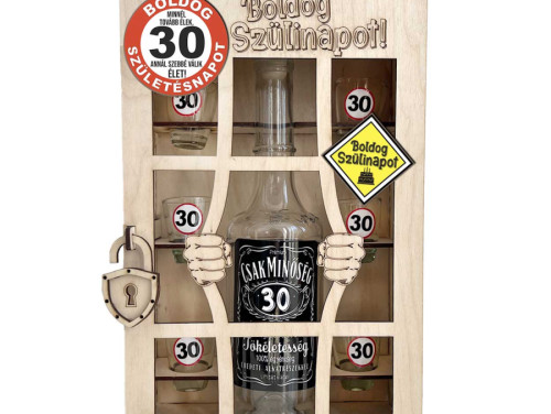 Ha igazán különleges és emlékezetes ajándékot keresel egy 30. születésnapra, akkor ez a börtönös italos szett garantáltan telitalálat! A fa börtön mögött egy 0,5 literes üveg és 6 darab feles pohár várja, hogy kiszabaduljon – mindegyik 30-as tematikával, humorral fűszerezve.