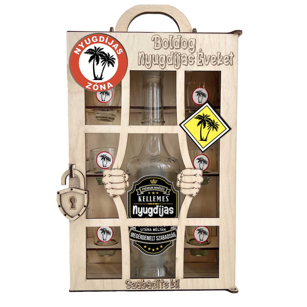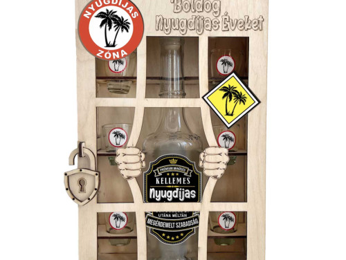 A nyugdíjba vonulás hatalmas mérföldkő, amit érdemes stílusosan megünnepelni! Ez az egyedi „Boldog Nyugdíjas Éveket” börtönös italos szett garantáltan mosolyt csal az ünnepelt arcára. A fából készült börtön dizájn egy 0,5 literes italos üveget és 6 feles poharat rejt, mind nyugdíjas témájú, vidám mintákkal: „Kellemes Nyugdíjas – Megérdemelt Szabadság” – mert a jól végzett munka után jár egy kis lazítás!