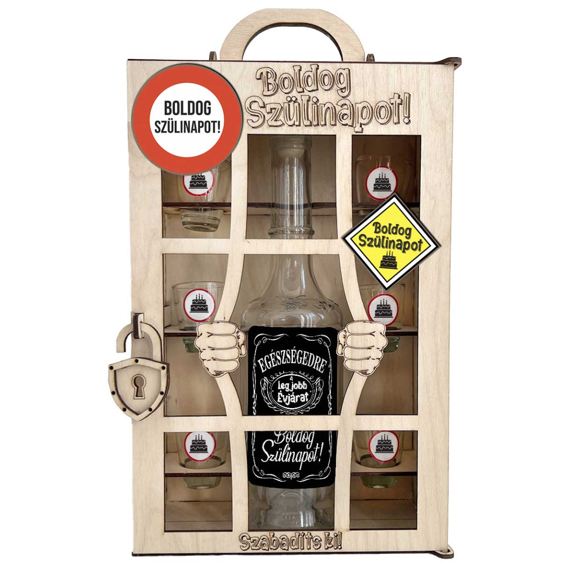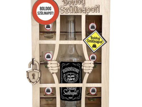 Lepd meg az ünnepeltet egy egyedi, börtönös italos szettel, amelynek fa díszdoboza garantáltan mosolyt csal mindenki arcára. A készletben egy 0,5 literes pálinkás üveg és 6 darab feles pohár kapott helyet, mindez igényesen lézervágott, gravírozott „rácsos” keretben. Ideális születésnapi ajándék férfiaknak és nőknek, kollégáknak, családtagoknak.