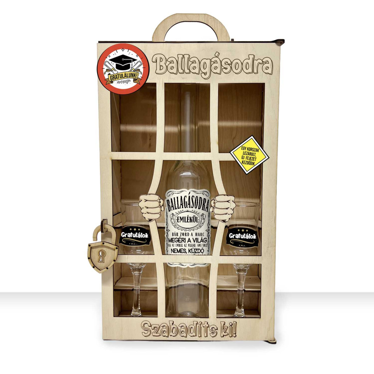 A látványos „rácsos” kialakítás mögött egy 0,5 literes, hosszúkás pálinkás üveg és 2 db grappás pohár kapott helyet. A ballagásra utaló feliratok és grafikák tökéletesen illenek az alkalomhoz, így az ajándék nemcsak vicces, hanem igazán személyes is.