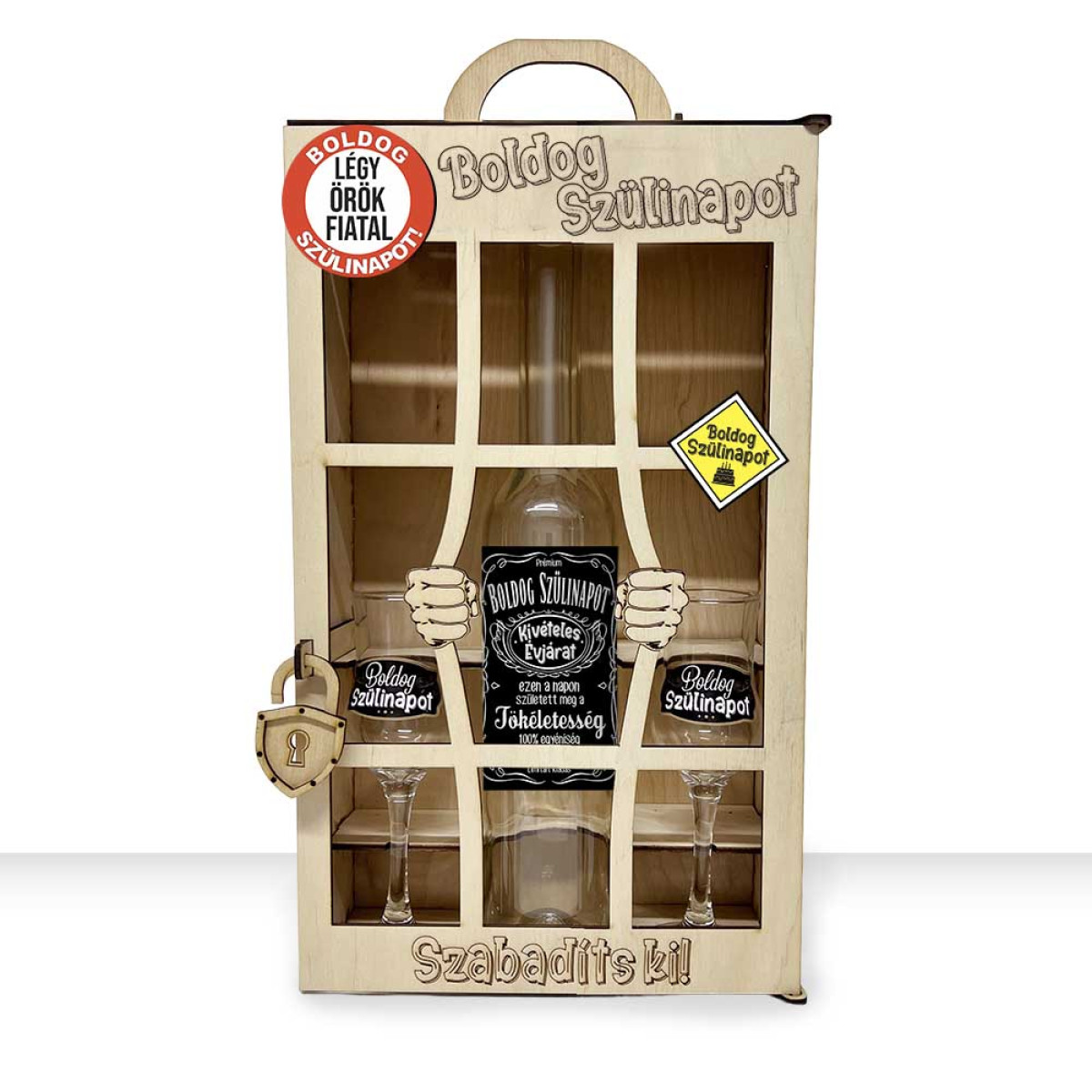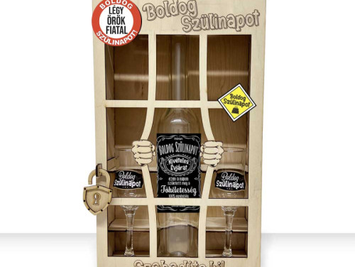 A masszív fa díszdoboz egy 0,5 literes, hosszúkás pálinkás üveget és 2 db grappás poharat rejt, mindezt egy látványos „börtön” kialakításban. Az üveg és a poharak születésnapi tematikájú feliratokat kaptak, így az ajándék teljes egészében az ünnepeltről szól.