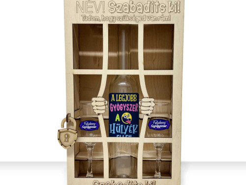Ez a vicces börtön formájú fa ajándékdoboz garantáltan betalál, hiszen a rácsok mögött egy 0,5 literes, hosszúkás pálinkás üveg lapul, mellette pedig 2 db grappás pohár „Folyékony gyógyszer” felirattal. Az alsó „Szabadíts ki!” gravírozás pedig egyértelmű üzenet: ideje alkalmazni a kezelést.