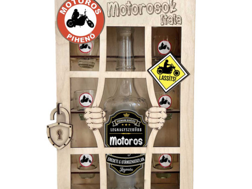 0 értékelés a következőhöz: Börtönös Pálinkás Italos Szett - Motorosok Itala Italos Szett – Motoros Ajándék Pálinkás üveggel és Poharakkal Fa Börtön Díszdobozban