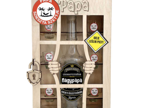 Ha szeretnéd meglepni nagypapádat vagy apukádat egy igazán különleges és humoros ajándékkal, akkor a „Papa – Börtönös Italos Szett” a tökéletes választás! A lézervágott fa börtön dizájn egy 0,5 literes üveget és 6 feles poharat rejt magában, vicces „A legnagyszerűbb Nagypapa” felirattal. Remek ajándék születésnapra, apák napjára vagy karácsonyra – mert egy kis pihenés és humor mindenkinek jár!