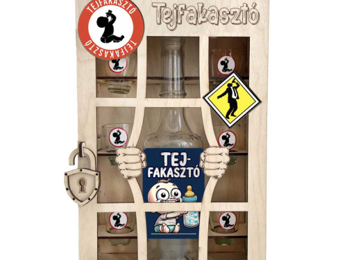 Ha a baba megszületett, ideje megünnepelni a nagy eseményt egy kis humorral! Ez a Tejfakasztó börtönös italos szett tökéletes ajándék újdonsült apukáknak. A fából készült börtön dizájn egy 0,5 literes italos üveget és 6 feles poharat tartalmaz – mind mókás tejfakasztó mintákkal és vidám feliratokkal, mint például „Tejfakasztó” és a kisbabás grafika.