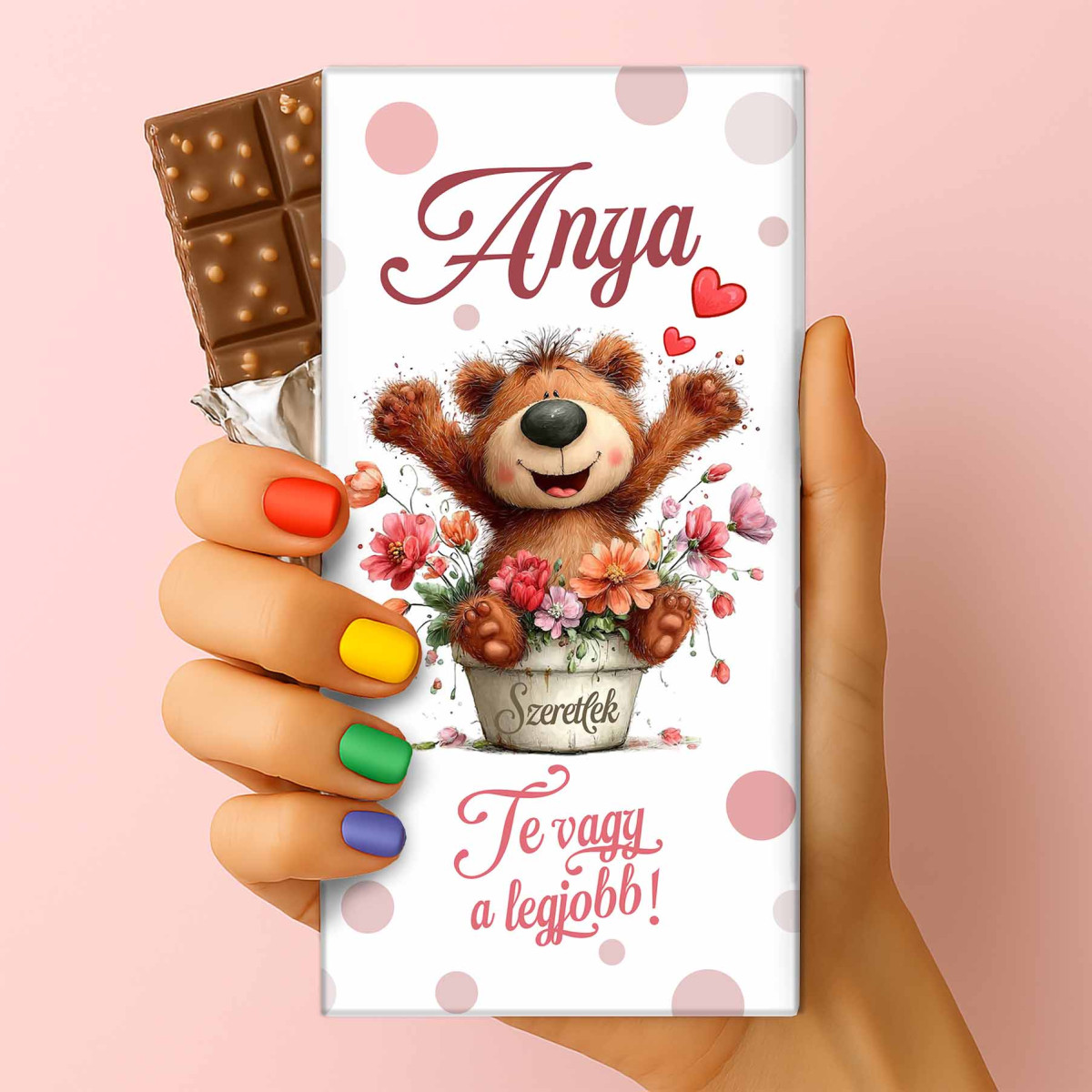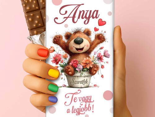 Szeretnéd meglepni Édesanyádat egy apró, de annál kedvesebb figyelmességgel? Ez a 75 grammos feliratos csokoládé garantáltan mosolyt csal az arcára! A vidám, virágkosárban ünneplő macis grafika és a „Te vagy a legjobb!” felirat pontosan azt üzeni, amit minden édesanya szívében érezni szeretne.