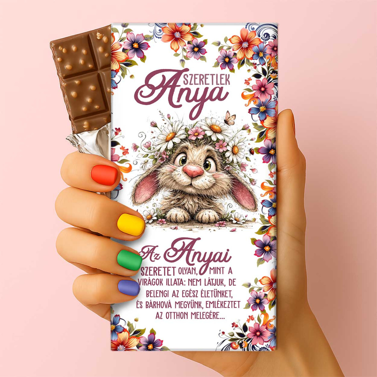 A csomagoláson egy tündéri, virágkoszorút viselő nyuszi látható, mellette pedig egy mélyenszántó idézet olvasható az anyai szeretet erejéről. Ez az édesség nemcsak a gasztronómiai élményről szól, hanem egy érzelmes üzenet is, így válik belőle egy valóban különleges ajándék anyának.