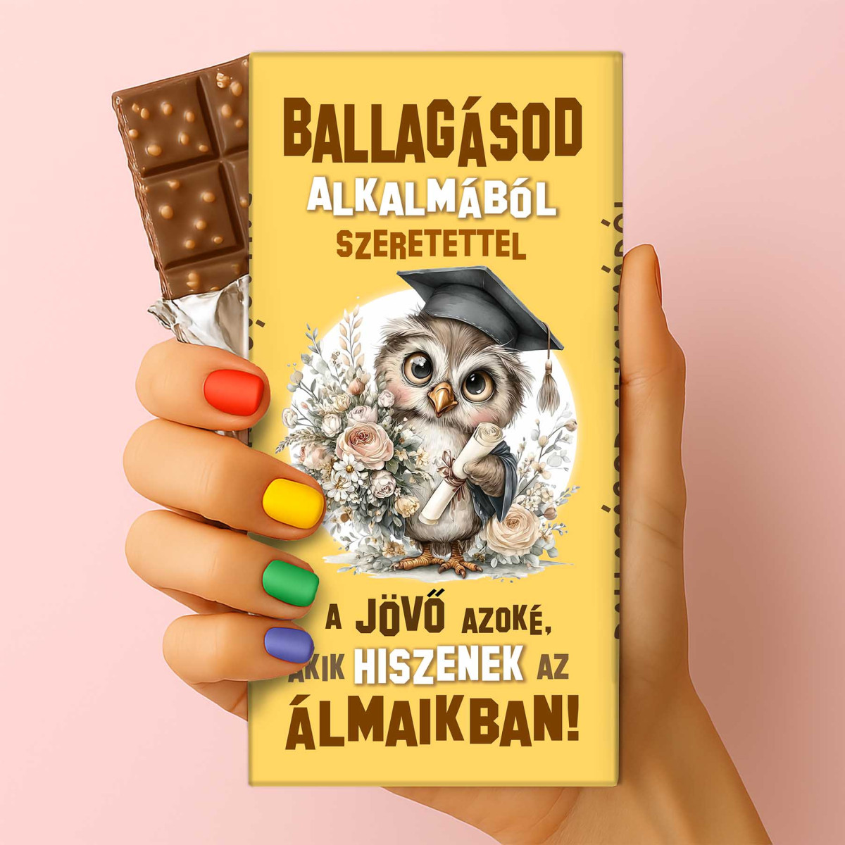 Ez a ballagási csoki kifejezetten azoknak készült, akik szeretik a mélyenszántó üzeneteket és a vidám megjelenést. Legyen szó óvodai ballagásról, középiskolai búcsúról vagy diplomaosztóról, ez az édesség a legédesebb módja annak, hogy sok sikert kívánj a következő fejezethez.
