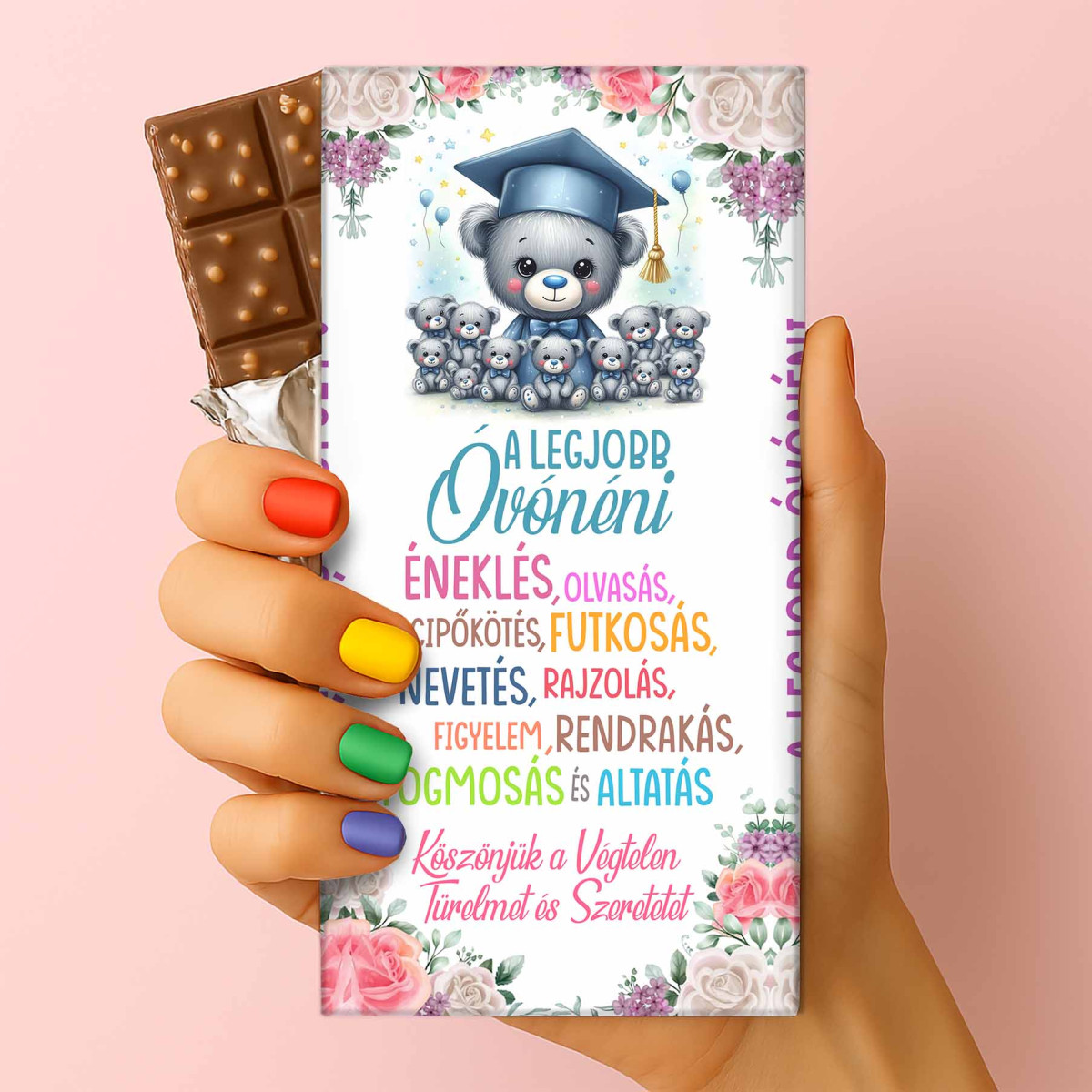 Ez a ballagási csoki nem csupán egy édesség, hanem egy kedves gesztus, amellyel az egész csoport nevében kifejezhetitek a hálátokat. Tökéletes kiegészítője egy virágcsokornak, de önmagában is méltó módon köszöni meg azt a végtelen türelmet, amit az óvónéni a gyerekekre fordított.