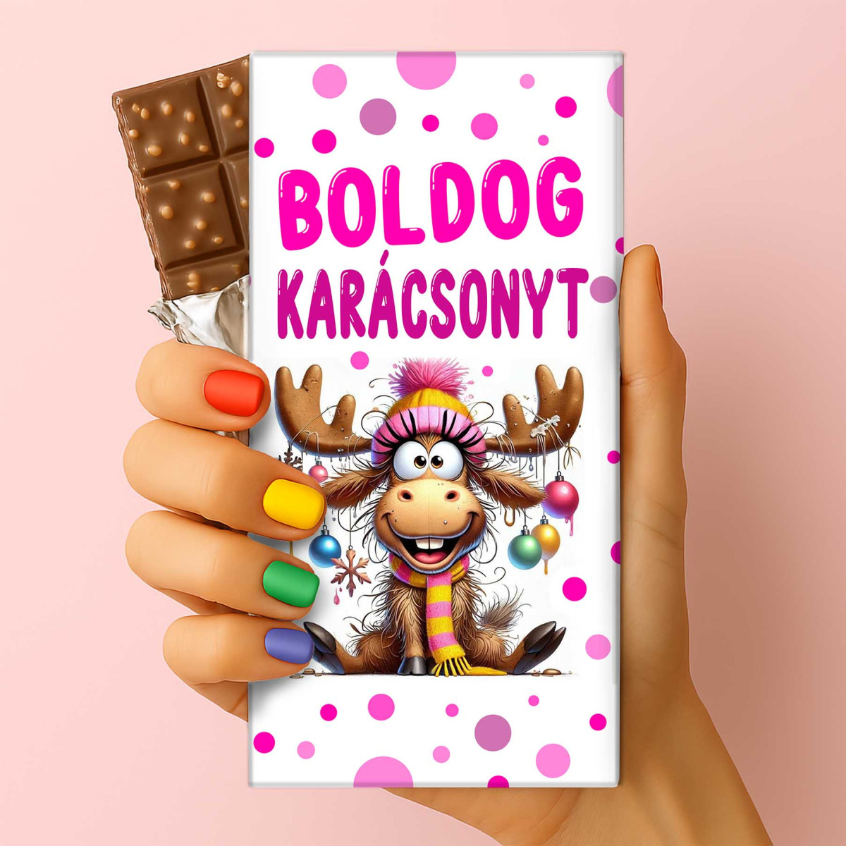 Édesítsd meg az ünnepeket ezzel a karácsonyi csokoládéval, amelyet egy mókás renszarvas és a Boldog Karácsonyt felirat díszít. A színes, ünnepi csomagolás garantáltan mosolyt csal mindenki arcára.