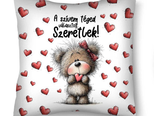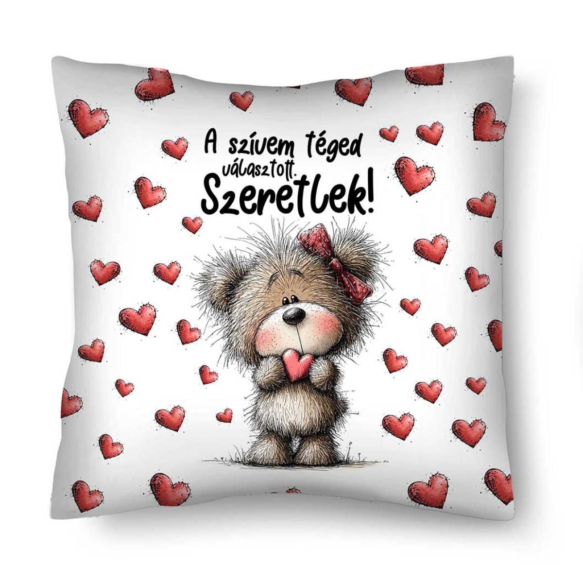Díszpárna (26×26 cm) „A szívem téged választott. Szeretlek!” – Szerelmes macis párna | Valentin napi ajándék