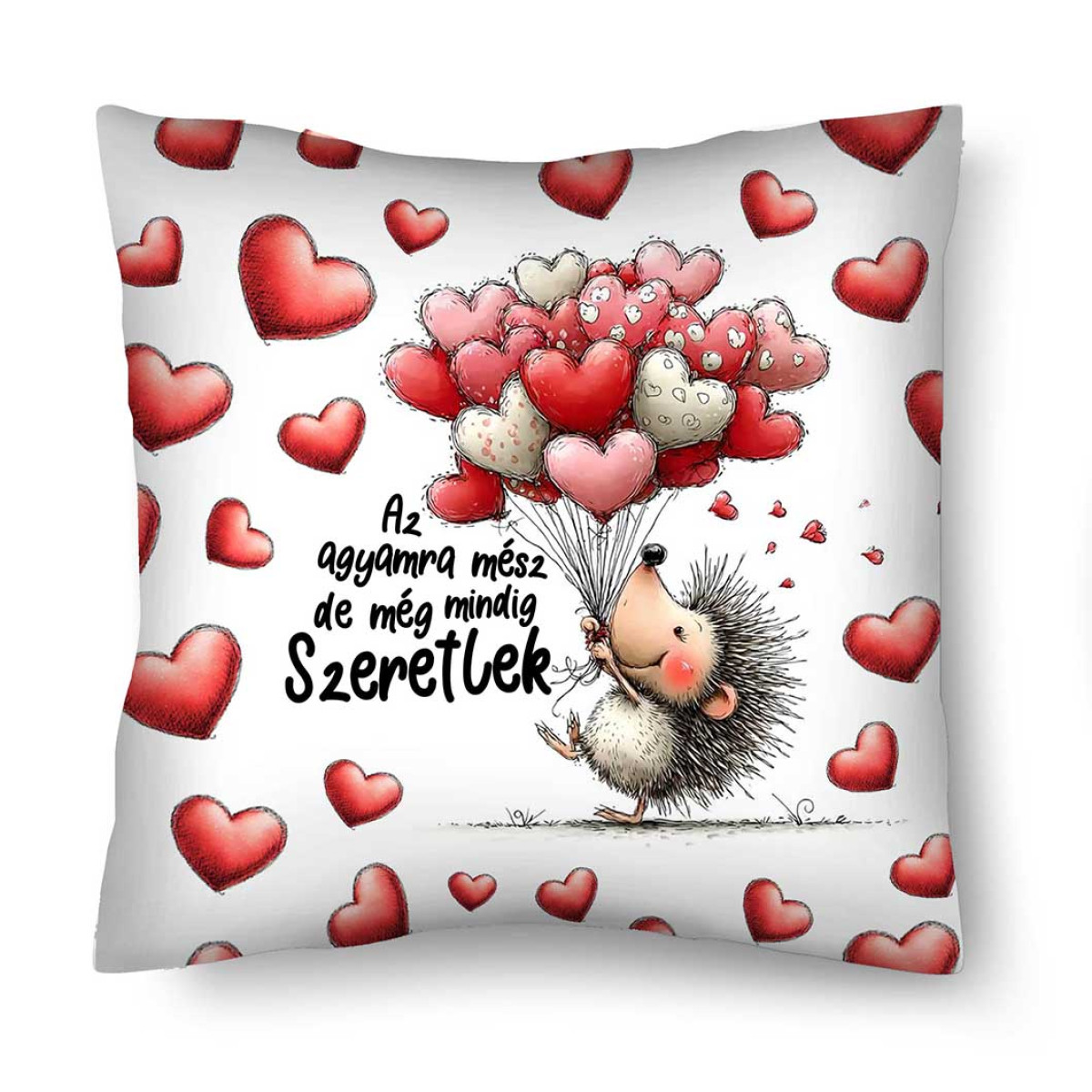 Díszpárna (26×26 cm) „Az agyamra mész, de még mindig szeretlek” – Vicces szerelmes sünis párna | Valentin-napi ajándék