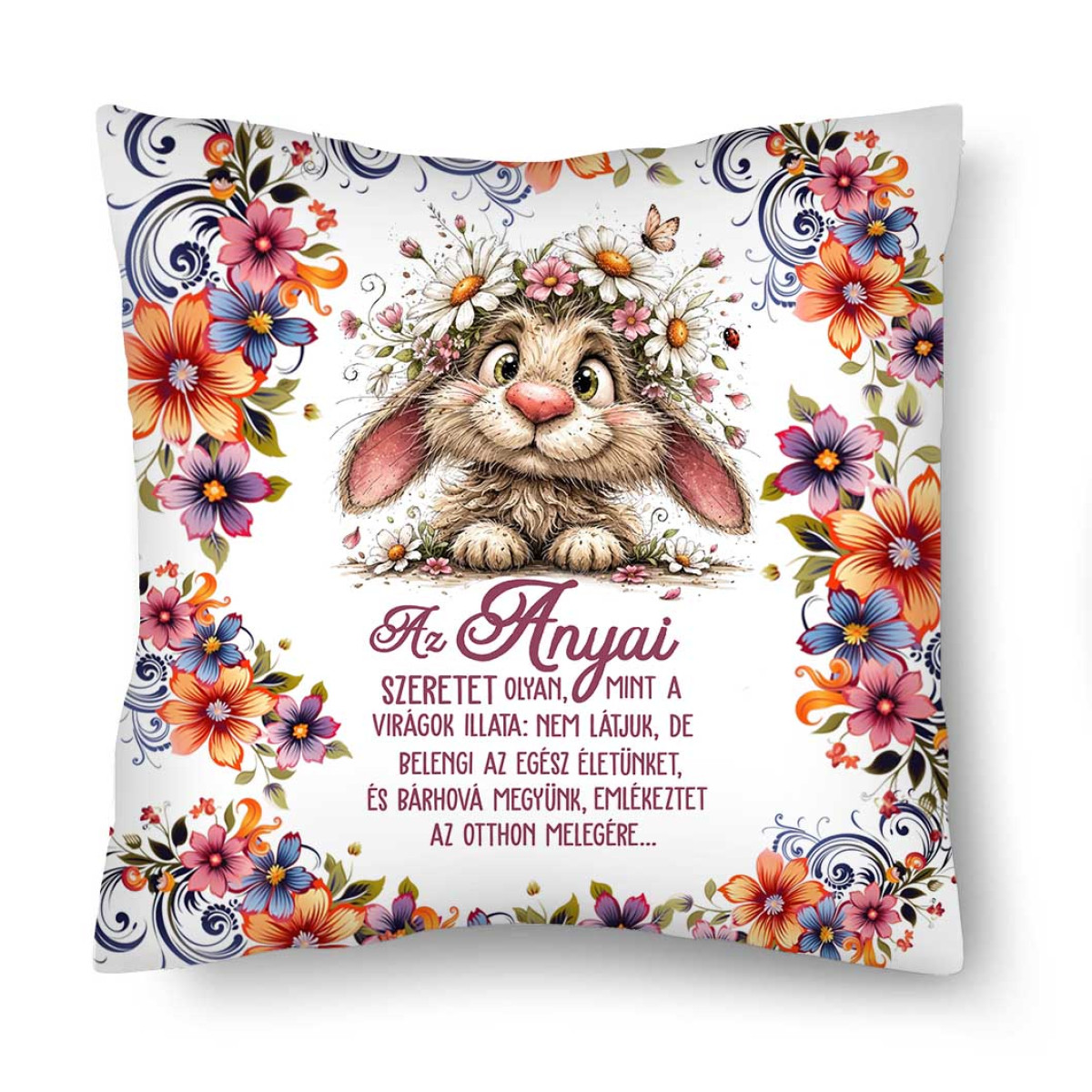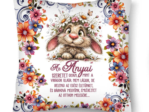 A párnán egy imádnivaló, virágkoszorút viselő nyuszi látható, melyet gazdag virágminta keretez. A grafika alatt egy mélyenszántó idézet olvasható az anyai szeretet erejéről, amely belengi az egész életünket. Ez a dekoratív kiegészítő tökéletesen kifejezi azt a gondoskodást és hálát, amit ezen a jeles napon mondanál el.
