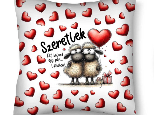 Díszpárna (26×26 cm) „Szeretlek – két bolond egy pár” – Szerelmes bárányos párna | Valentin napi ajándék