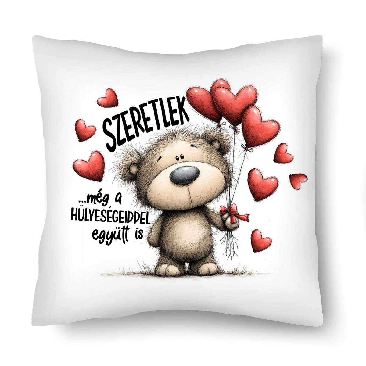 Díszpárna (26×26 cm) „Szeretlek… még a hülyeségeiddel együtt is” – Vicces szerelmes macis párna | Valentin-napi ajándék