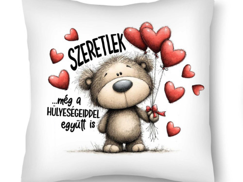 Ez az aranyos és humoros „Szeretlek… még a hülyeségeiddel együtt is” feliratú díszpárna tökéletes választás azoknak, akiknél a szerelemhez egy kis nevetés is jár. A kedves mackó szíves lufikkal a kezében pontosan azt üzeni, amit minden kapcsolatban érzünk: nem vagy tökéletes – és pont ezért szeretlek.