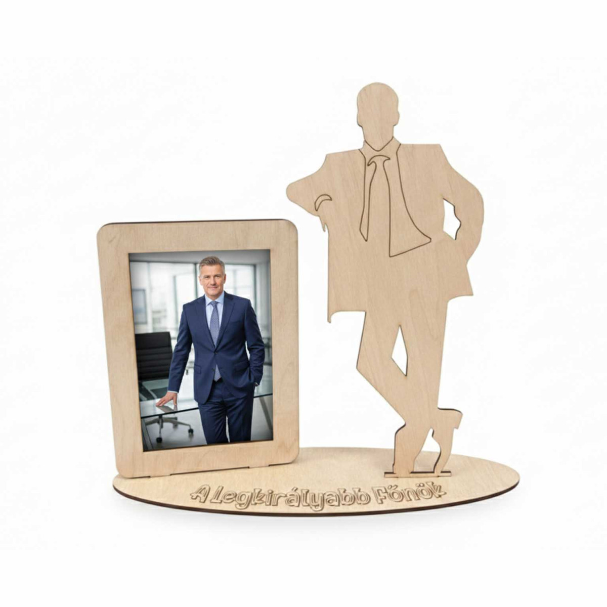 A termék jobb oldalán egy magabiztos, öltönyös férfisziluett látható, amely eleganciát és tekintélyt sugároz. Az ovális talpon precíz, égetett gravírozással készült „A Legkirályabb Főnök” felirat olvasható, amely elegáns és modern betűtípusával bármilyen irodai környezetbe illeszkedik.