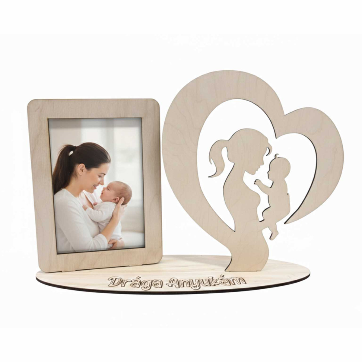 A termék jobb oldalán egy látványos, lézerkivágott szív motívum látható, amelyben egy anya és gyermeke sziluettje jelenik meg, jelképezve az elszakíthatatlan családi köteléket. Az ovális talpon elegáns, gravírozott „Drága Anyukám” felirat olvasható, amely még személyesebbé teszi az ajándékot.