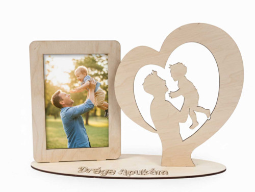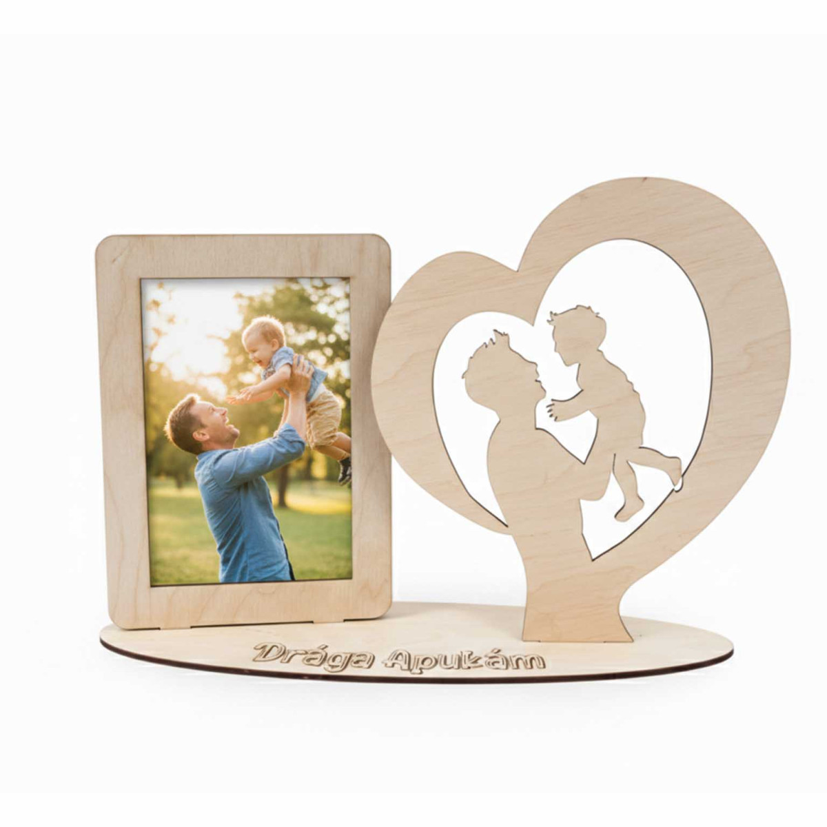 A fényképtartó különlegessége a jobb oldalon elhelyezkedő, szív alakú keretbe foglalt sziluett, amely egy apa és gyermeke közötti önfeledt pillanatot örökít meg. Az alapzaton található precíz, gravírozott „Drága Apukám” felirat teszi ezt a darabot valódi, személyre szóló emlékké.