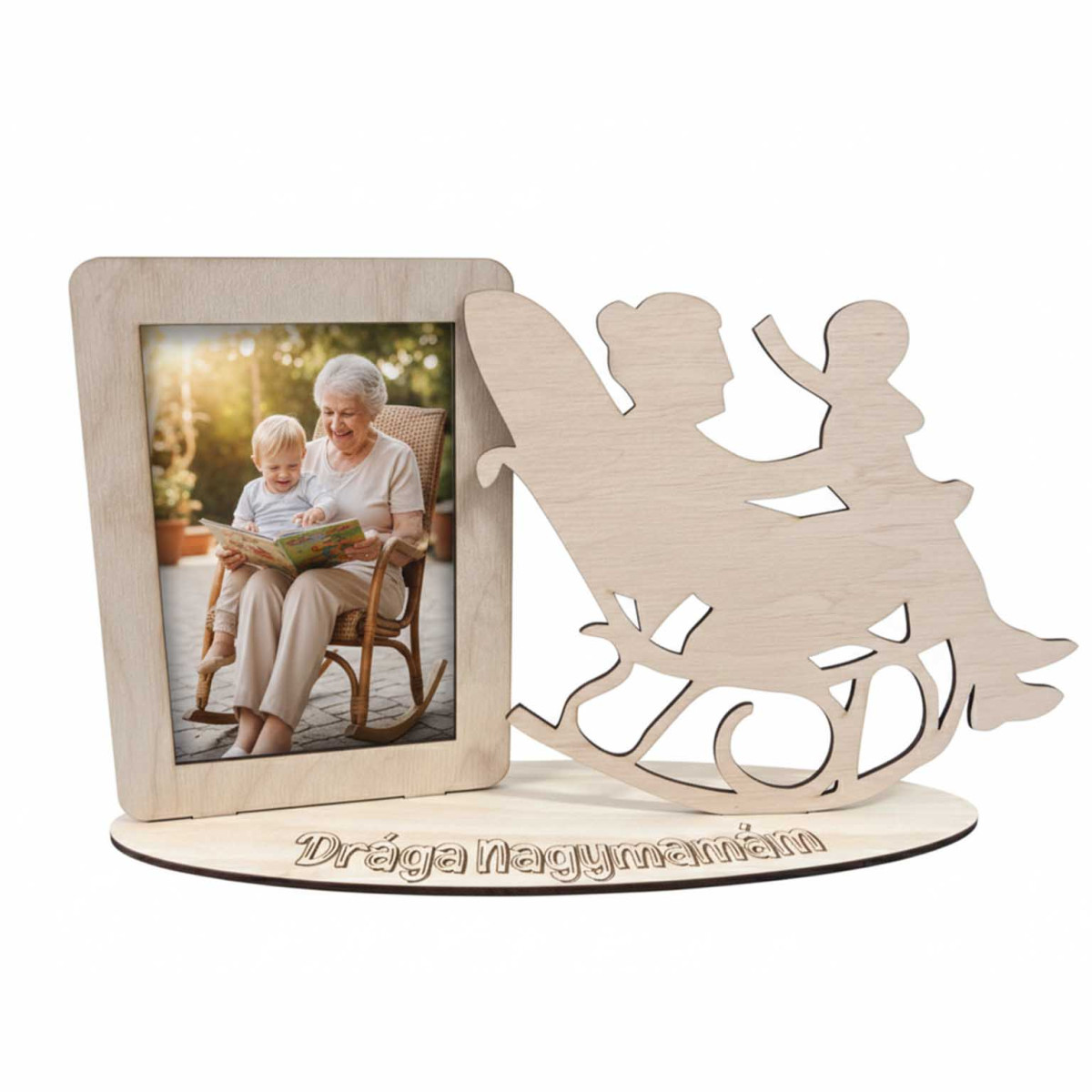 Egyedi Lézerkivágott Fa Képkeret – „Drága Nagymamám” Fényképtartó Hintaszékes Sziluettel