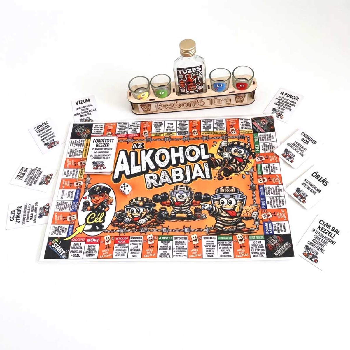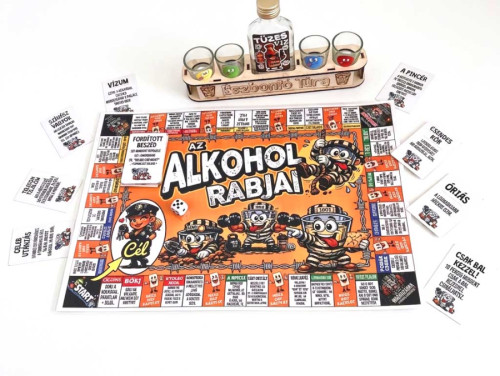 Készen állsz egy felejthetetlen (vagy épp nehezen felidézhető) éjszakára? Az Alkohol Rabjai nem egy egyszerű társasjáték, hanem egy garantált hangulatjavító "túlélőtúra", ahol a szerencse és a humor diktálja a tempót!