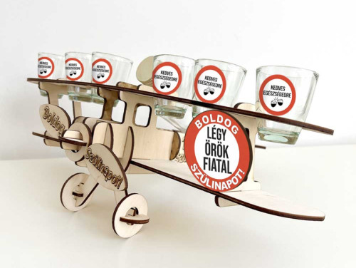Csak helyezd el kedvenc tömény italodat (pálinka, whisky, vodka stb.) a repülő tartójában, töltsd meg a feles poharakat, és máris kész a tökéletes, azonnal bevethető **szülinapi ajándék**!