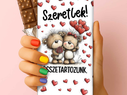 Feliratos puffasztott rizses csokoládé – „Szeretlek, összetartozunk” | Páros macis szerelmes csoki (75 g)