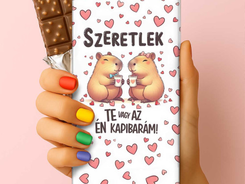 Ha egy igazán cukiságfaktoros, mégis finom meglepetést keresel, ez a feliratos puffasztott rizses csokoládé telitalálat. A csomagoláson a kedves üzenet – „Te vagy az én kapibarám!” – két aranyos kapibarával és szívecskékkel díszítve igazi szerelmes ajándék, amit garantáltan mosollyal fogadnak.
