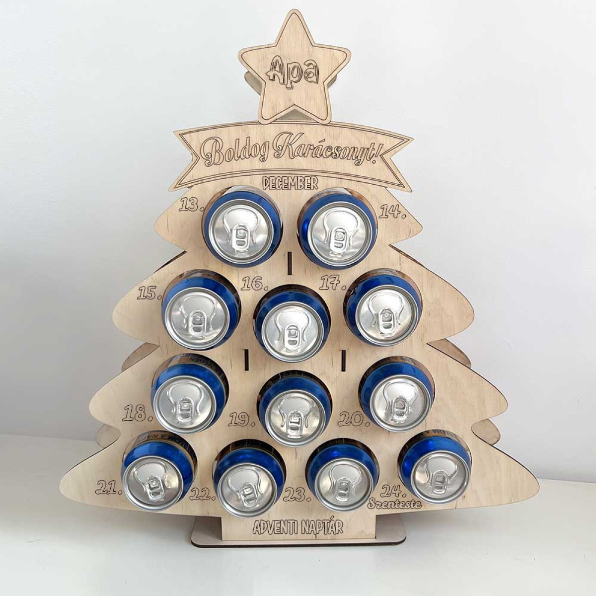 Keresel egy ötletes, mégis igényes karácsonyi ajándékot apának? Ez a karácsonyfa alakú, lézervágott fa sörös adventi naptár 12 doboz sörnek ad helyet, így az advent minden napja (dec. 13–24.) egy újabb bontási élmény. Letisztult natúr fa megjelenés, precíz gravírozás és stabil, dísznek is mutatós dizájn.