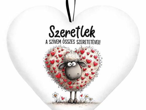 Kicsi szív párna (25×21 cm) „Szeretlek a szívem összes szeretetével!” bárányos Valentin-napi ajándék