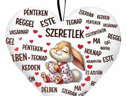 A szeretet nem csak egy napra szól. Reggel, este, ma, holnap – és mindig. Ez a kicsi szív alakú párna egy aranyos nyuszis mintával és a „Szeretlek” felirattal pontosan ezt az üzenetet közvetíti.