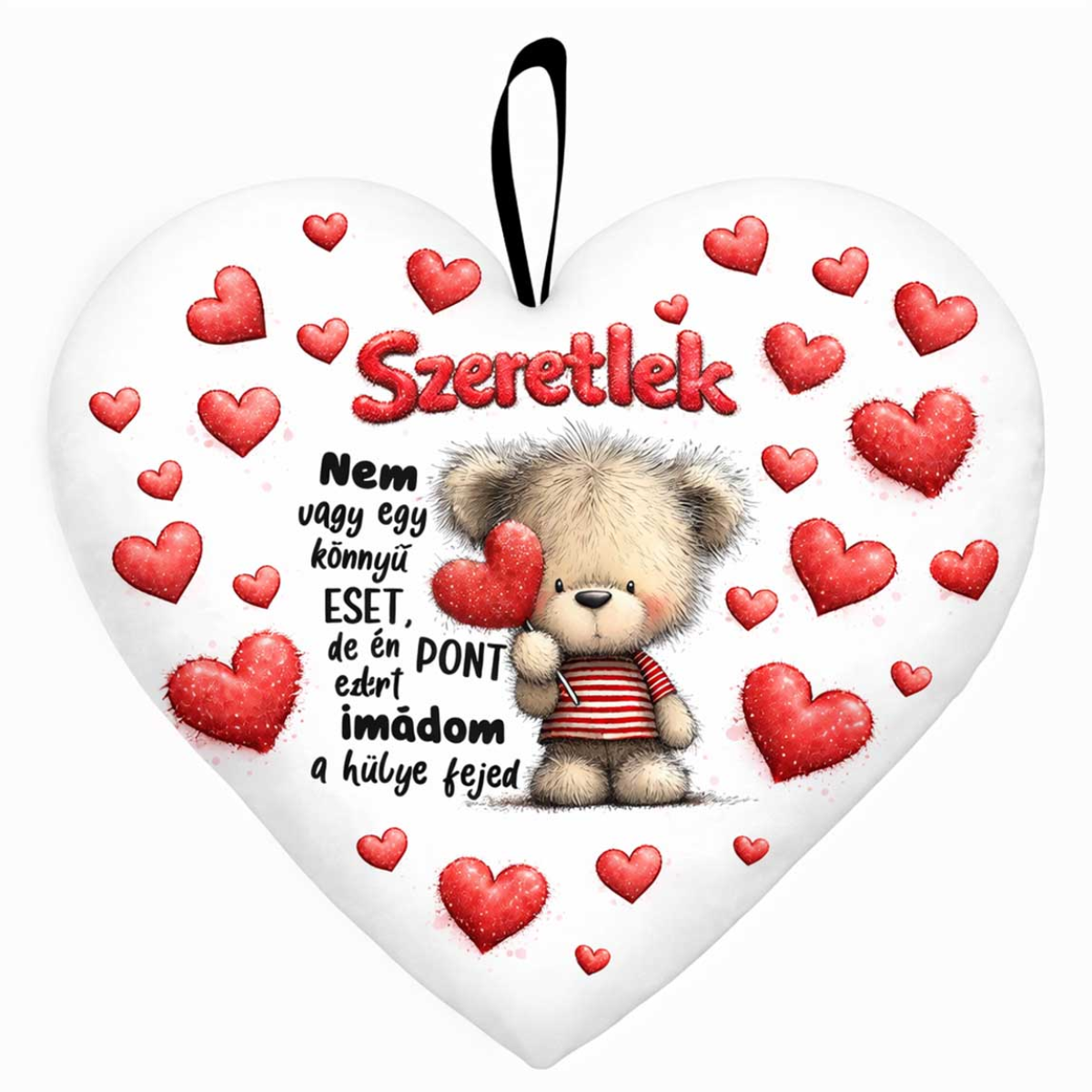 Ez a szív alakú párna azoknak szól, akik tudják: a szerelem nem mindig cukormázas, de attól még őszinte és nagyon szerethető. A mosolygós maci és a vicces felirat tökéletesen megfogalmazza azt, amit sokan gondolnak – csak nem mindig mondanak ki.