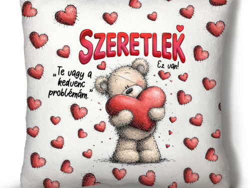 Ez a kedvesen vicces, macis mintájú plüss párna tökéletes választás, ha egy humoros, mégis romantikus Valentin-napi ajándékot keresel. A szívecskés illusztráció és az őszinte felirat mosolyt csal annak az arcára, aki igazán közel áll hozzád.