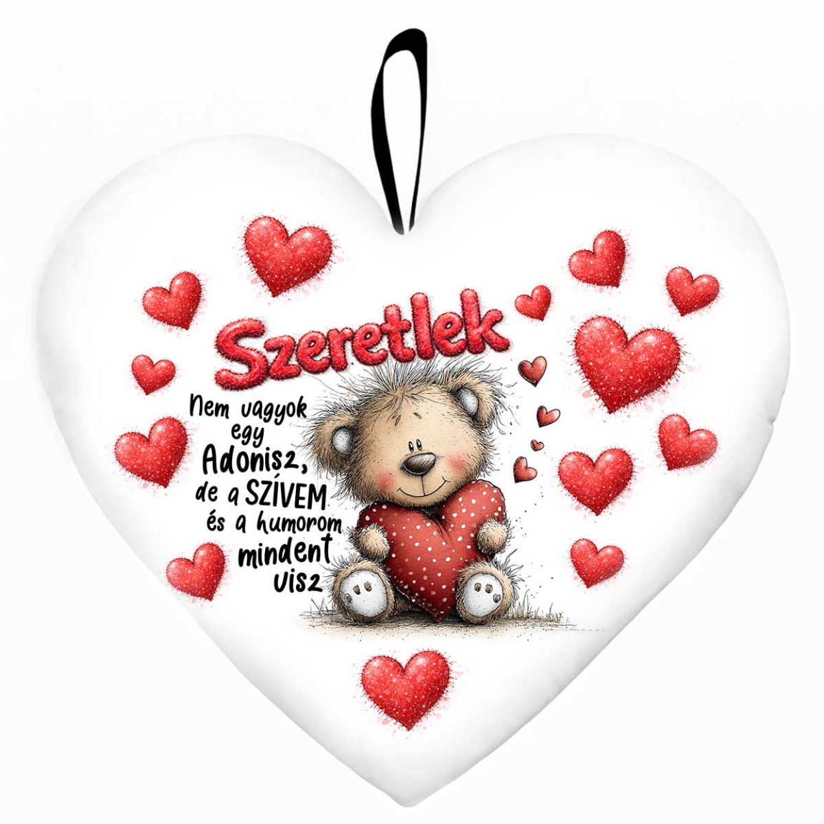 Nagy szív párna (45 cm) – „Nem vagyok egy Adonisz” macis párna | Valentin Napi Ajándék