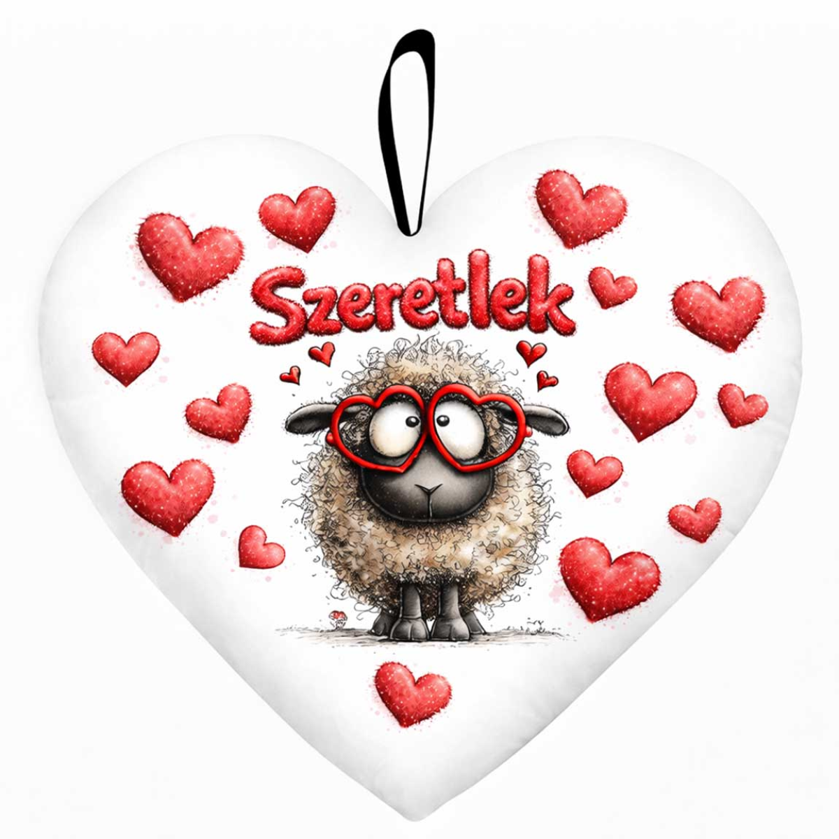 Nagy szív párna (45 cm) – „Szeretlek” szemüveges bárányos párna | Valentin Napi Ajándék