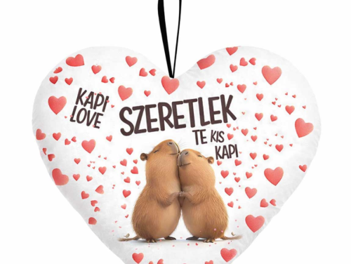 A szívecskés háttér, az egymást ölelő kapibarák és a felirat: „Szeretlek, te kis Kapi” egyértelműen üzeni: összetartozunk, fontos vagy nekem. Tökéletes dísz a kanapén vagy az ágyon, és közben bármikor bevethető egy nagy öleléshez is.
