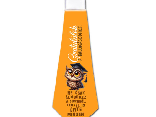 A ballagás mérföldkő, amely után megkezdődik a tettek ideje. Ez a ballagási nyakkendő nemcsak egy kiegészítő, hanem egy napi emlékeztető a ballagó számára, hogy az álmok eléréséhez cselekvésre van szükség. A vibráló narancssárga elemek és a vidám bagoly figura élettel telivé teszi az ünnepi megjelenést.