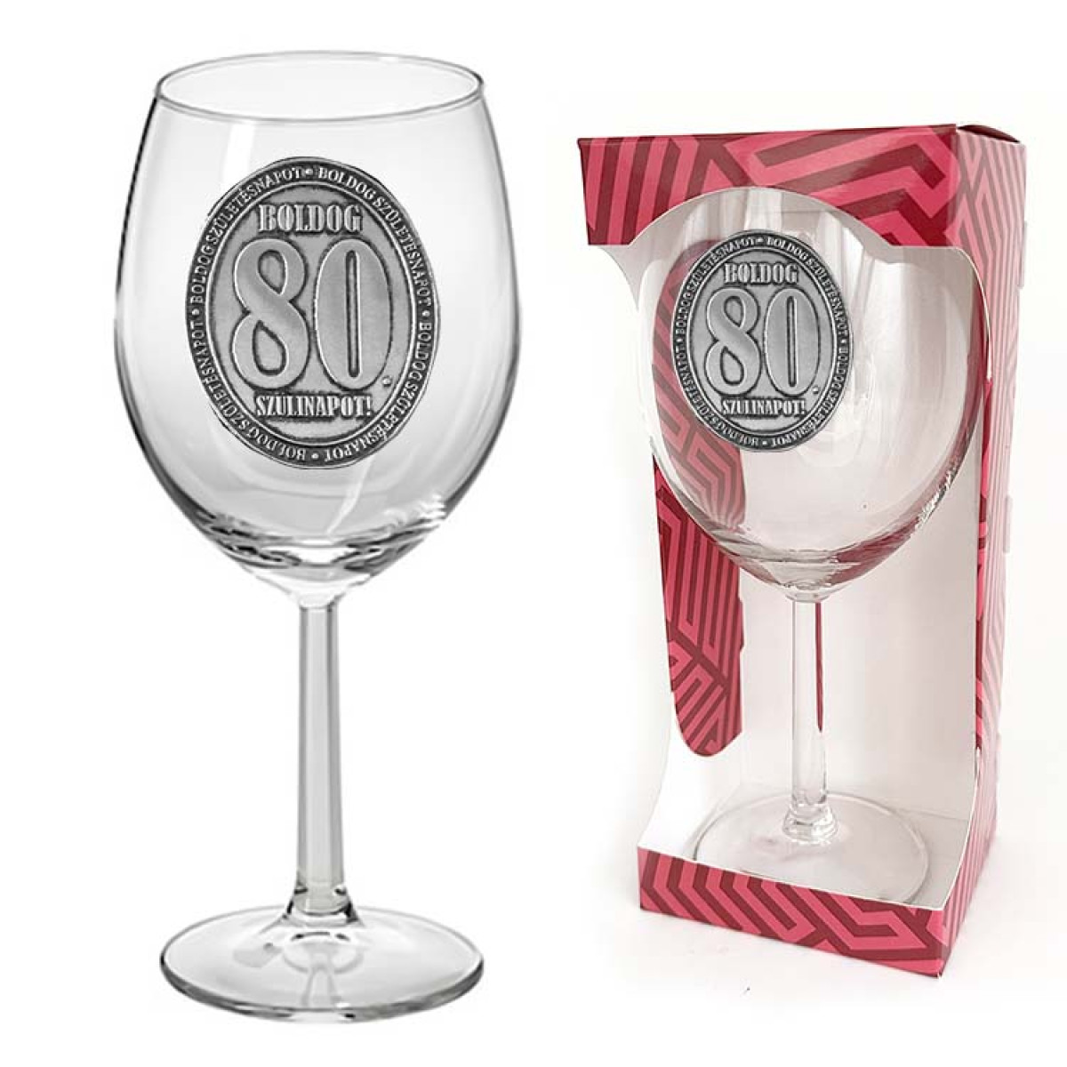 - Nemes jubileumi díszítés: A poharat egy antikolt ezüst hatású, dombornyomott fém embléma ékesíti, büszke „Boldog 80. Szülinapot!” felirattal.