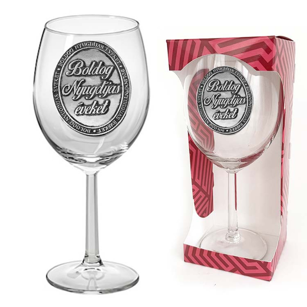 - Egyedi üzenet: A poharat egy antikolt hatású, mívesen kidolgozott fémcímke díszíti, melyen a „Boldog Nyugdíjas Éveket!” felirat olvasható.
