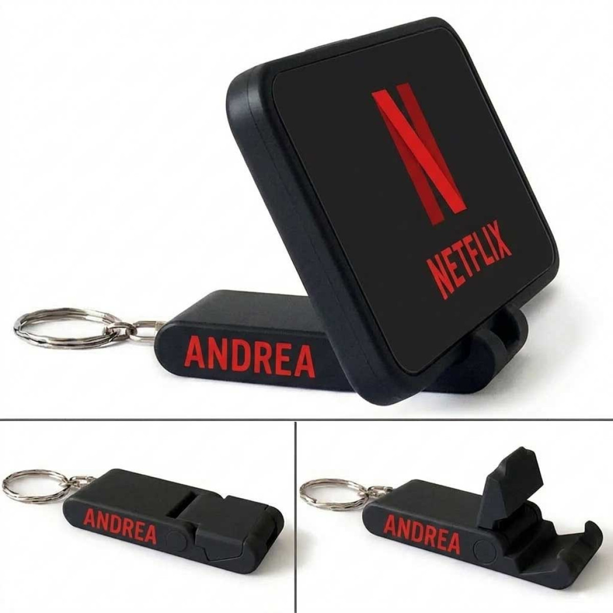 PocketView™ Black & Red - Fekete Piros felirattal - Egyedi Névvel, Felirattal Rendelhető Összecsukható Asztali Telefontartó és Kulcstartó